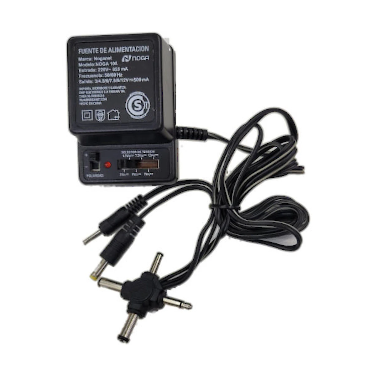 Modelo / Numero de parte: NG-105 EAN / UPC: No disponible Codigo AndesPC: 0301001 Descripcion del producto: Fuente multiple Multivoltaje Marca Noganet modelo NG-105. Caracteristicas principales - Entrada: 220Vca 50Hz 8.7VA. - Salida: 3/4.5/6/7.5/9/12V. - Maxima corriente: 500mA. - Potencia: 3.6VA. - 6 Tipos de conectores:. 1 Miniplug: 3,5 mm. 5 Huecos: 2,5 x 0,7 / 3,5 x1,1 /4,0 x 1,7 / 5 x 3 / 5,5 x 2,5. - Selector de Polaridad |