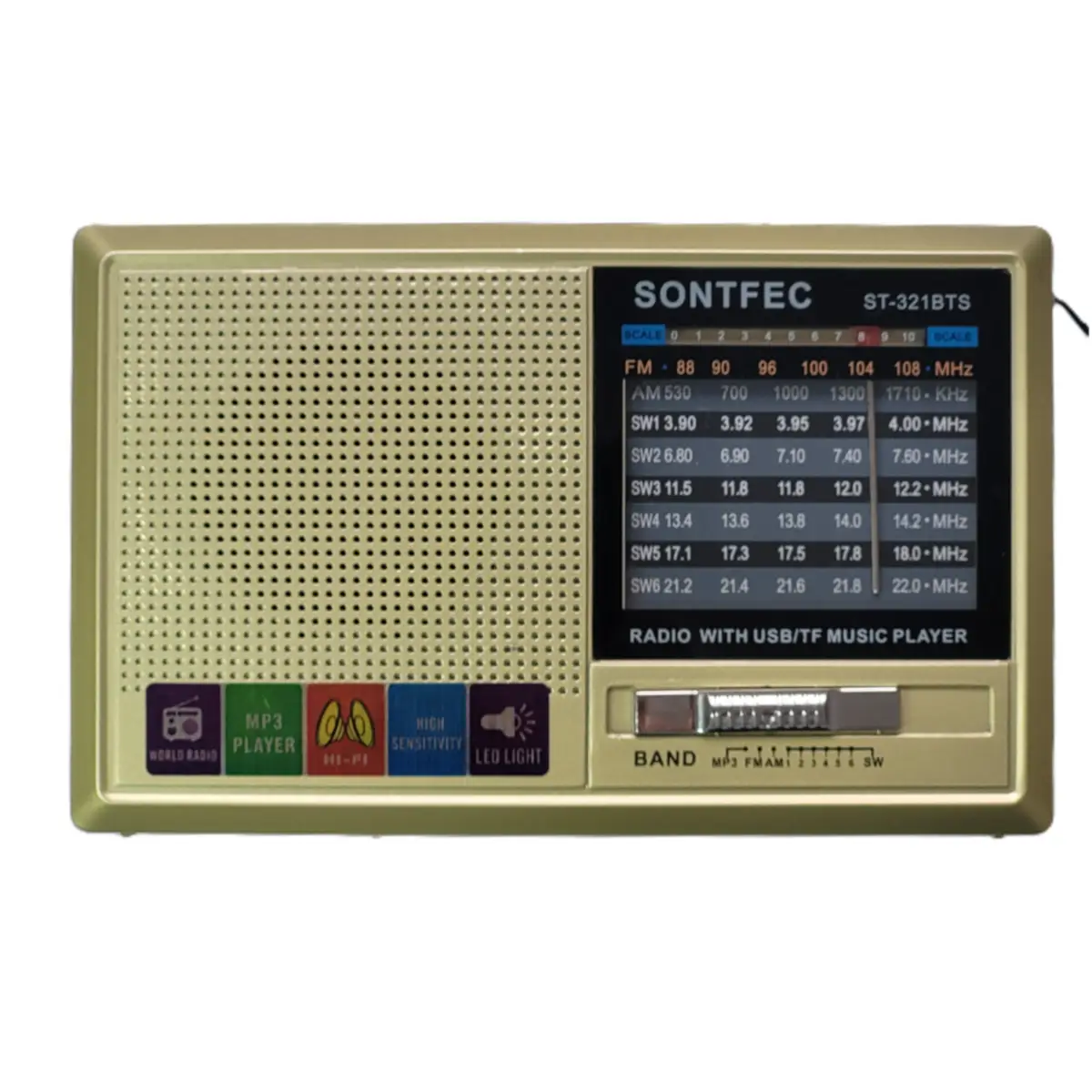 Modelo / Numero de parte: ST-321BTS Dorada EAN / UPC: No disponible Codigo AndesPC: 0309021 Descripcion del producto: Radio AM/FM Bluetooth con carga por USB o carga solar, lector tarjeta y pendrive con MP, linterna Caracteristicas principales - Marca Sonftec - Modelo ST-321BTS - Color Plateado/Negro - Voltaje 5V - Frecuencia AM/FM - Tipo de alimentacion Carga por USB-C y carga Solar - Tipo de radio Analogico - Con puerto USB para mp3 Si - Con entrada para tarjeta SD Si - Con Bluetooth Si - Con linterna Si - Con salida para auriculares Si - Dimensiones 15 x 11,5 x 5,2 cm - EAN: | Sin stock Volver |